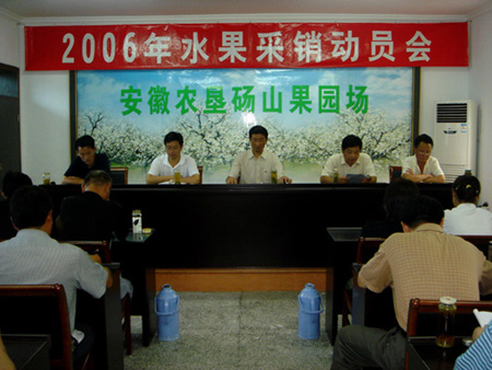 2006年水果采销工作将全面拉开帷幕,为确保采销工作的顺利进行,8月12日,砀山果园场召开水果采销工作会议,全场各级管理人员参加了会议。会议就如何做好今年的水果采销工作进行了具体部署,要求各单位主要领导务必根除以租代管、以收代管的思想,充分发挥国有农场“统”的功能和优势。各级管理人员要提高认识,增强服务意识,努力做好采销工作。