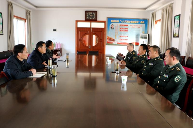 1226,安庆军分区副司令员闻心平偕后勤保障处、大观区人武部主要领导一行,来皖河农场调研基层武装工作,场领导王苏平、徐英晴等参加座谈。