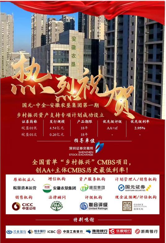 据悉,该项目为全国首单乡村振兴商业房地产抵押贷款支持证券(CMBS)项目,债券总发行规模为4.80亿元,其中“皖垦01优”发行规模为4.54亿元,发行期限为18年,票面利率为2.95%;“皖垦01次”发行规模为0.26亿元,发行期限为18年。债券发行利率创全国AA+主体CMBS 有史以来最低。该项目增信机构为安徽农垦集团,原始权益人和资产服务机构分别为安徽农垦集团下属的皖垦资本运营公司、通和集团公司,计划管理人为国元证券股份有限公司。