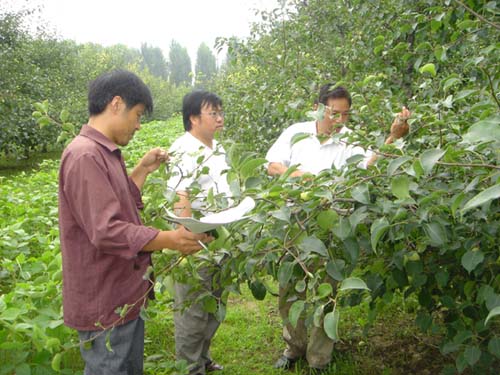 此次检查共分6组,重点检查内容:疏果、病虫防治及果园卫生。采取定点抽查,百分制记分法。全场共查62个园片,328株梨树。