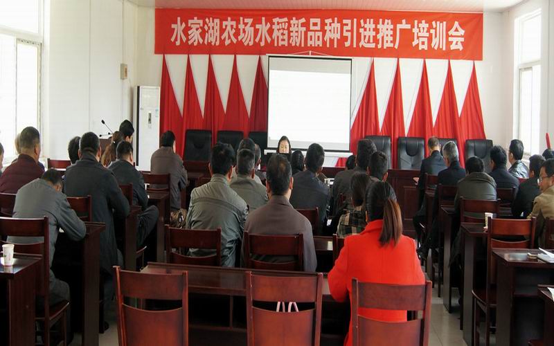413,水家湖农场举办水稻新品种引进推广培训会,特邀淮南农场总农艺师王玉叶来场为水稻种植户开办专题讲座,讲授了麦秸全量还田水稻旱直播高产栽培技术要点。